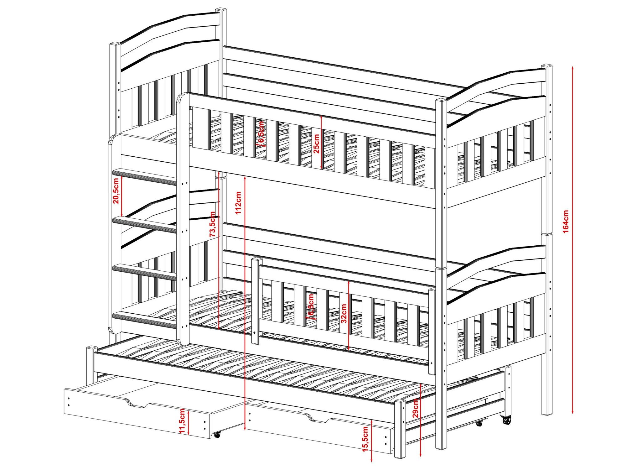 Køjesengen leveres komplet med stor udtræksseng, opbevaringsskuffer udført i lamineret spånplade.